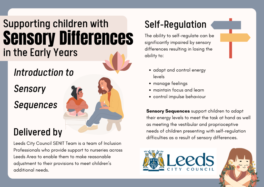 The Inclusion Team from Leeds City Council has provided us with the SENSORY SEQUENCES strategy, which is a structured, movement-based strategy inspired by Sensory Circuits (click to find out more) often used at schools, but too structured for younger children. Sensory Sequences are designed to help children regulate their sensory systems, preparing them for learning and supporting positive behaviour. It typically consists of a short sequence of physical activities—divided into alerting, organising, and calming stages—that target different aspects of sensory processing. By moving through these stages, children learn to better regulate their arousal levels, which in turn supports emotional control, focus, and social behaviour. Sensory Sequences are especially helpful for children with sensory processing difficulties, autism, ADHD, or emotional regulation challenges, offering them a proactive and supportive way to start the day or reset when needed.